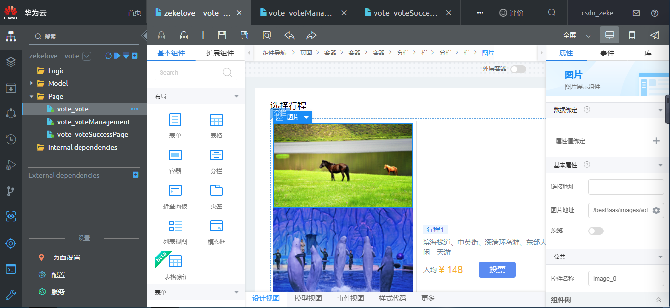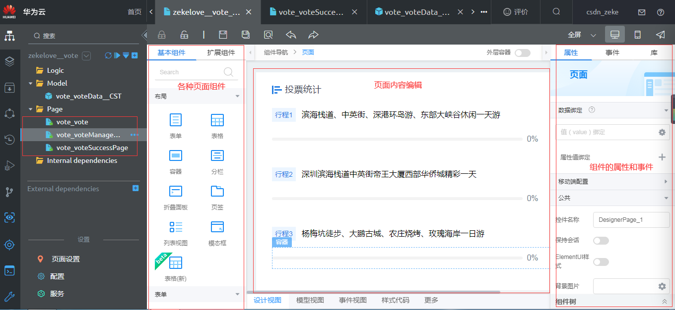 - 在AppCube开发环境首页“项目”页签的“我的应用”下,单击“vote”,进入应用开发页面。