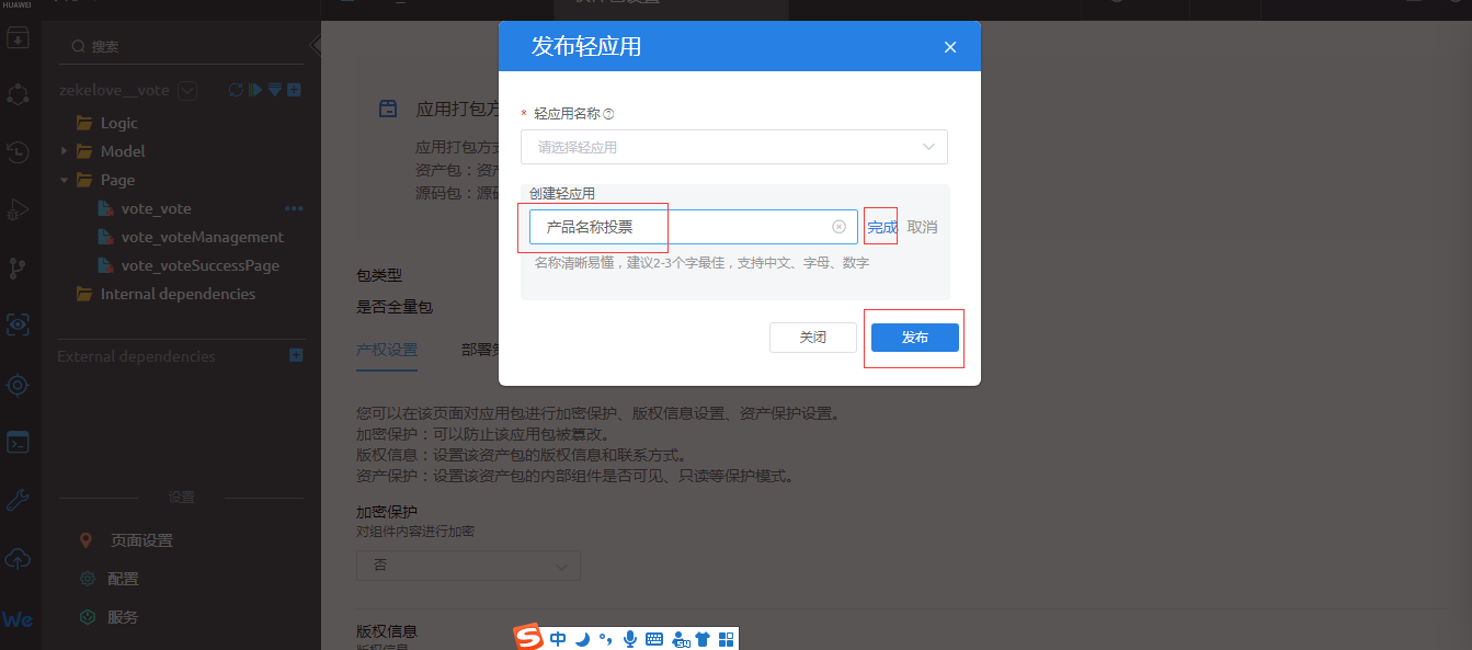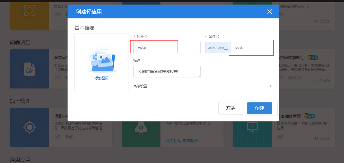输入待创建轻应用的名称,单击“完成”。本示例名称设置为“产品名称投票”。