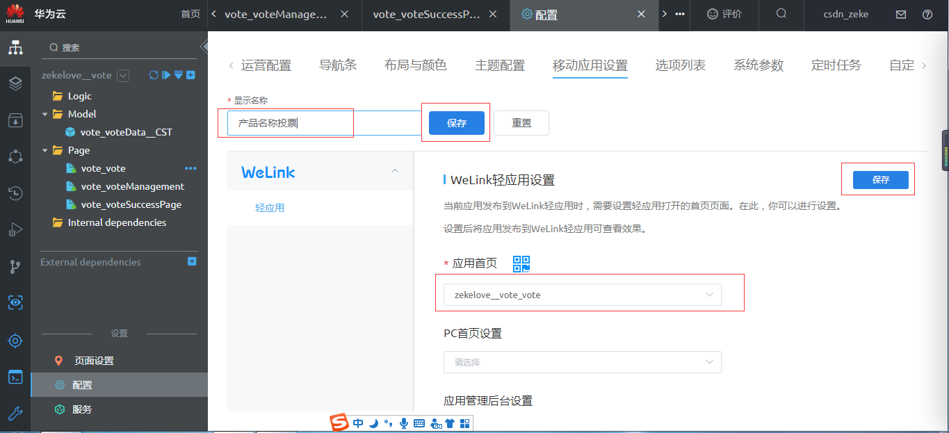 - 应用首页:选择“zekelove__vote_vote”页面作为WeLink H5轻应用的主页。单击使用WeLink扫一扫可体验在WeLink上打开该页面的效果。