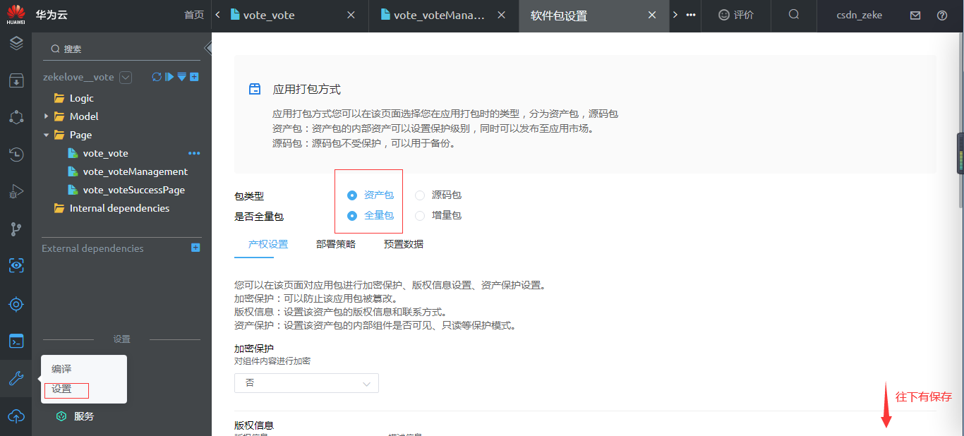- 在左侧导航栏上,单击左下角设置,选择“设置”,在“设置”页面,选择“资产包”,单击“保存”