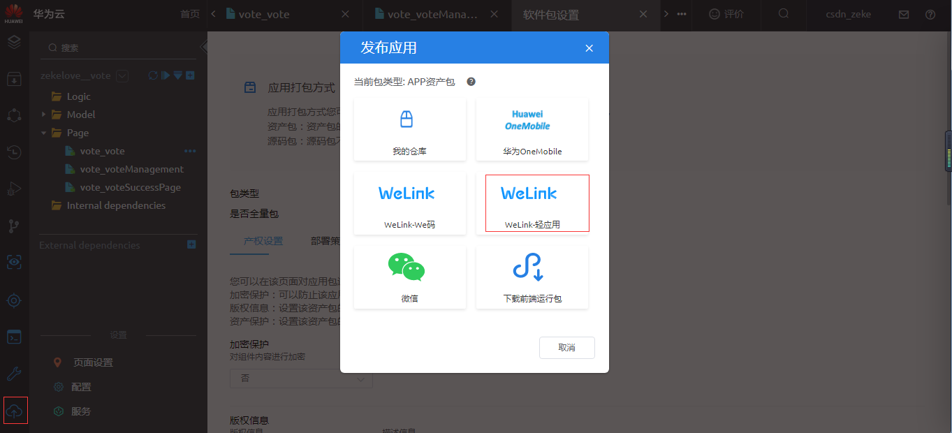 4.编译完成后,单击发布图标,选择“WeLink-轻应用”。