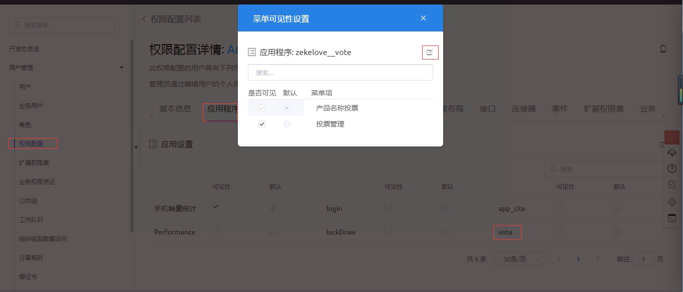 - 在权限配置详情中,单击“应用程序设置”页签,单击,选中该应用的“可见性”复选框,单击。配置应用可见性。