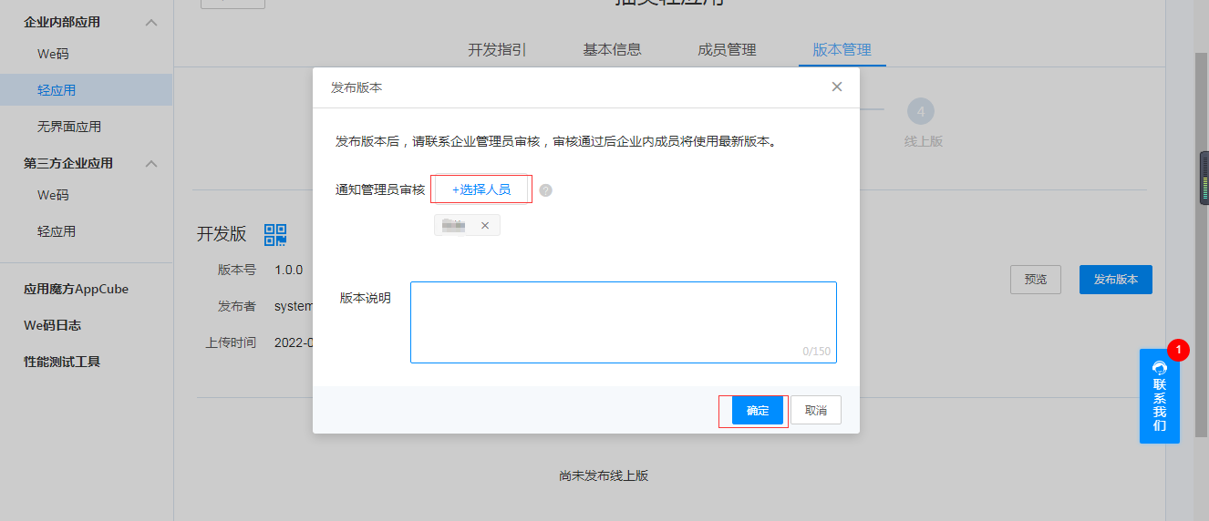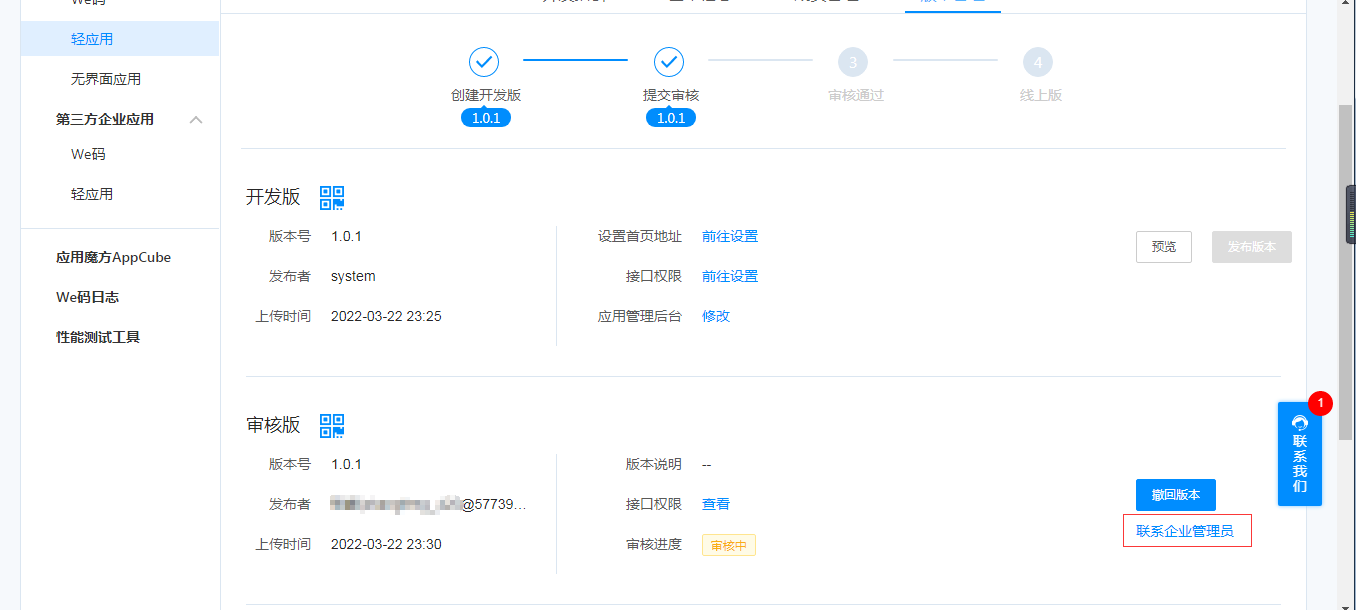 提交审核后,页面将显示“审核版”,单击“联系企业管理员”,在弹窗中单击“复制”,可将应用发布审核链接发送给审核员审核发布版本,单击“关闭”。