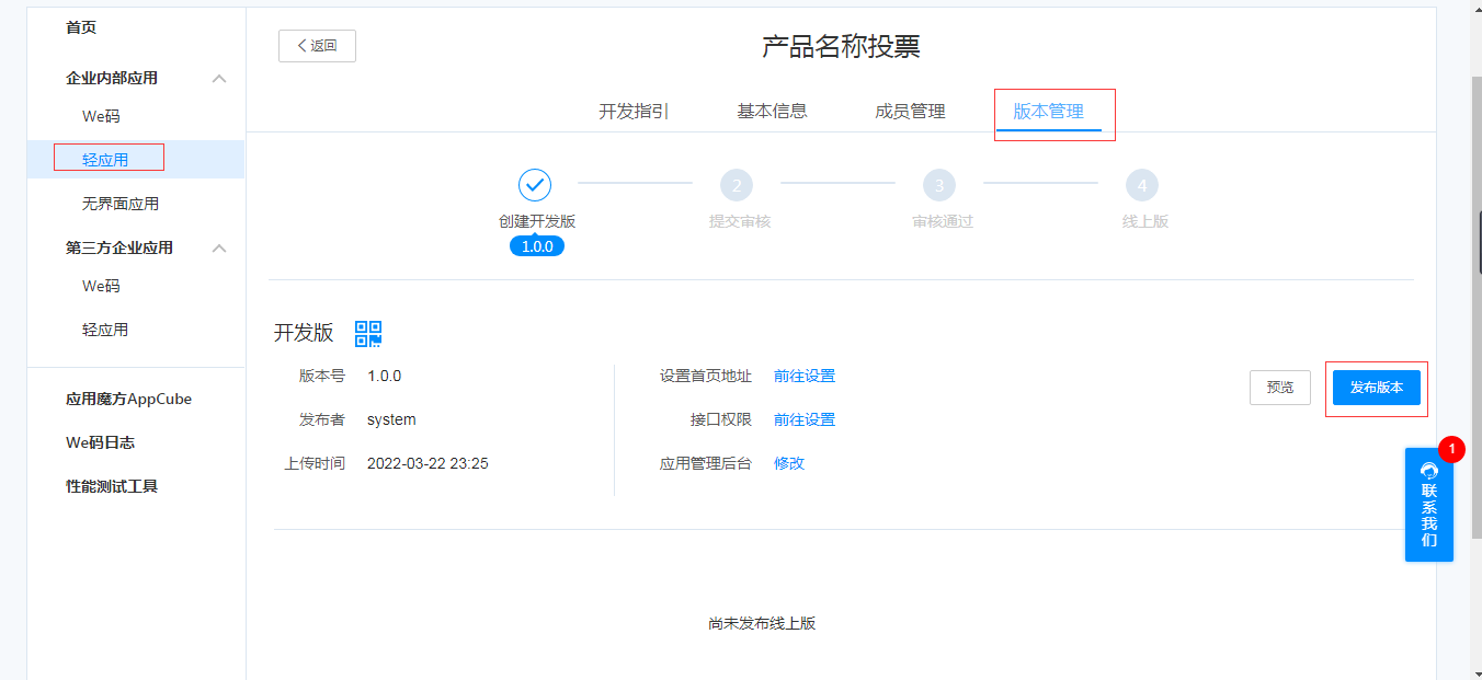 点击“应用名”,在“版本管理”中,单击“发布版本”。