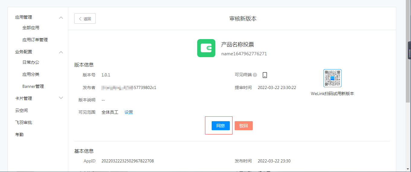 审核员打开应用发布审核链接,登录后,单击“审核新版本”,若是应用测试阶段,可设置部分测试人员可见,再单击“同意”。