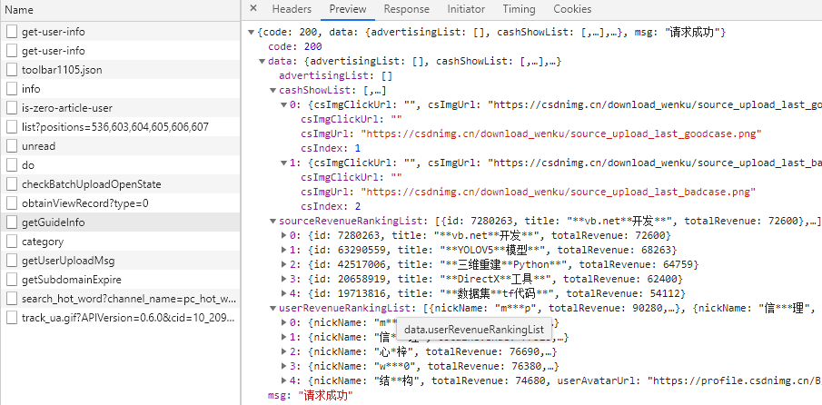 按照上述思路的第一条,通过开发者工具获取了接口数据,在得到接口数据之后,发现此路不通,原因如下所示: