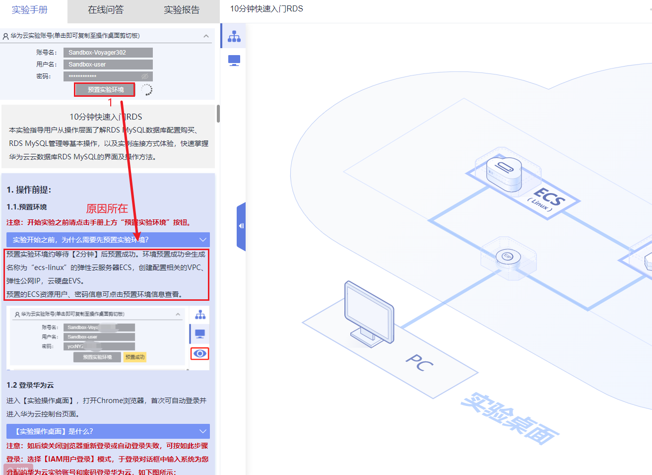 是用户进入华为云沙箱实验室页面,点击【开始实验】时,系统自动为用户分配的一台供用户进行实验操作的终端设备,该设备预安装了实验所需的软件和工具。