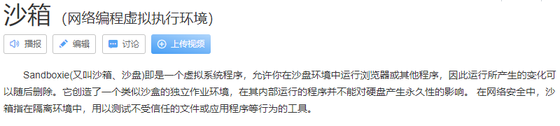 说白了,就是一种满足安全策略与限制程序行为的执行环境,上面百度百科有更加详细描述,理解到这么多就行