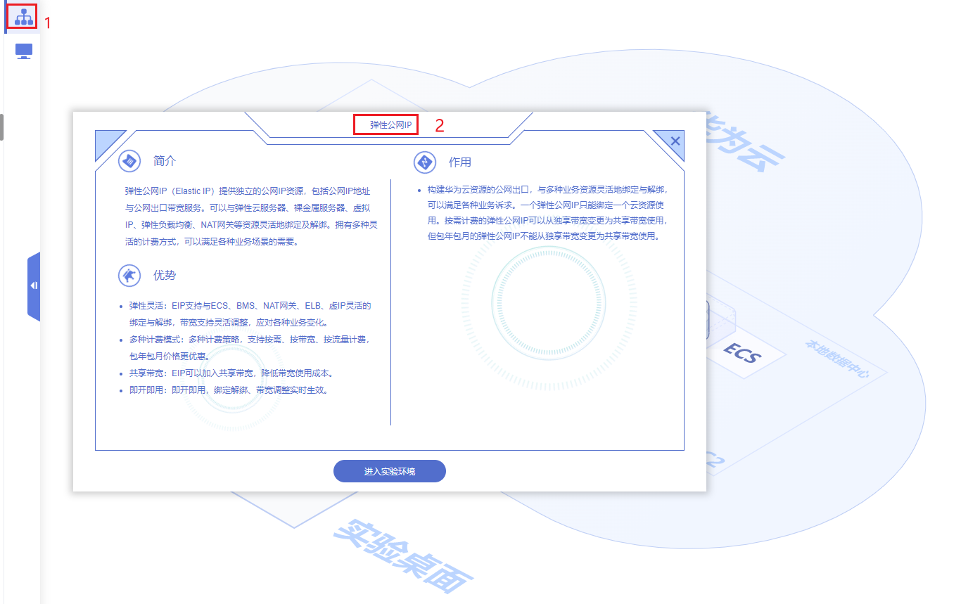 点击【开始实验】之后,进入实验操作页面,左方是实验手册展示区域,右方展示的是实验拓扑图,实验手册与实验拓扑图之间的菜单栏上有一个小电脑图标,点击该图标可进入【实验操作桌面】。