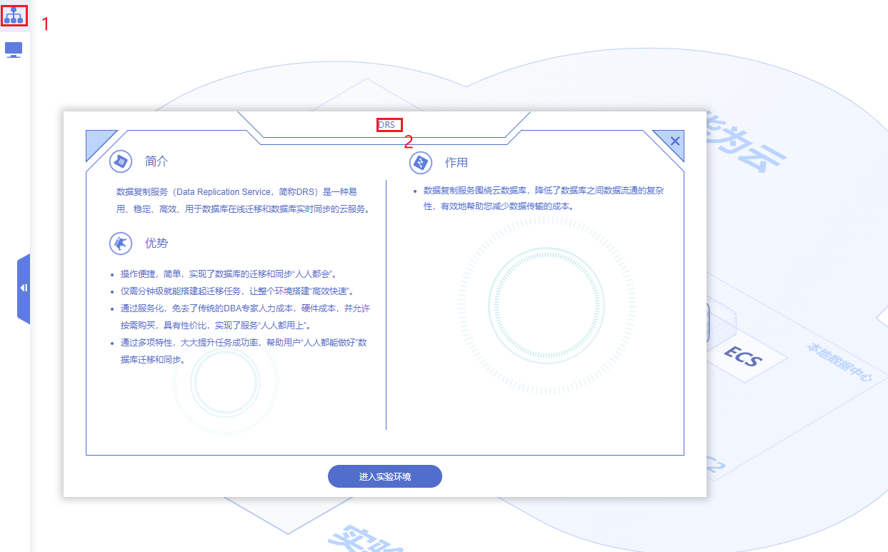 - 2 然后左侧的服务列表图标,选择“数据库 > 数据复制服务 DRS”。