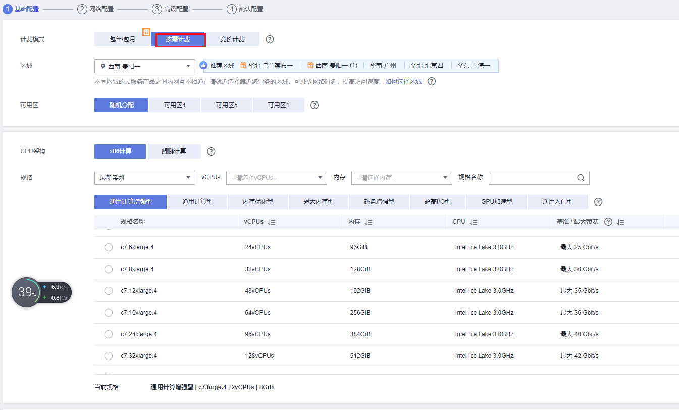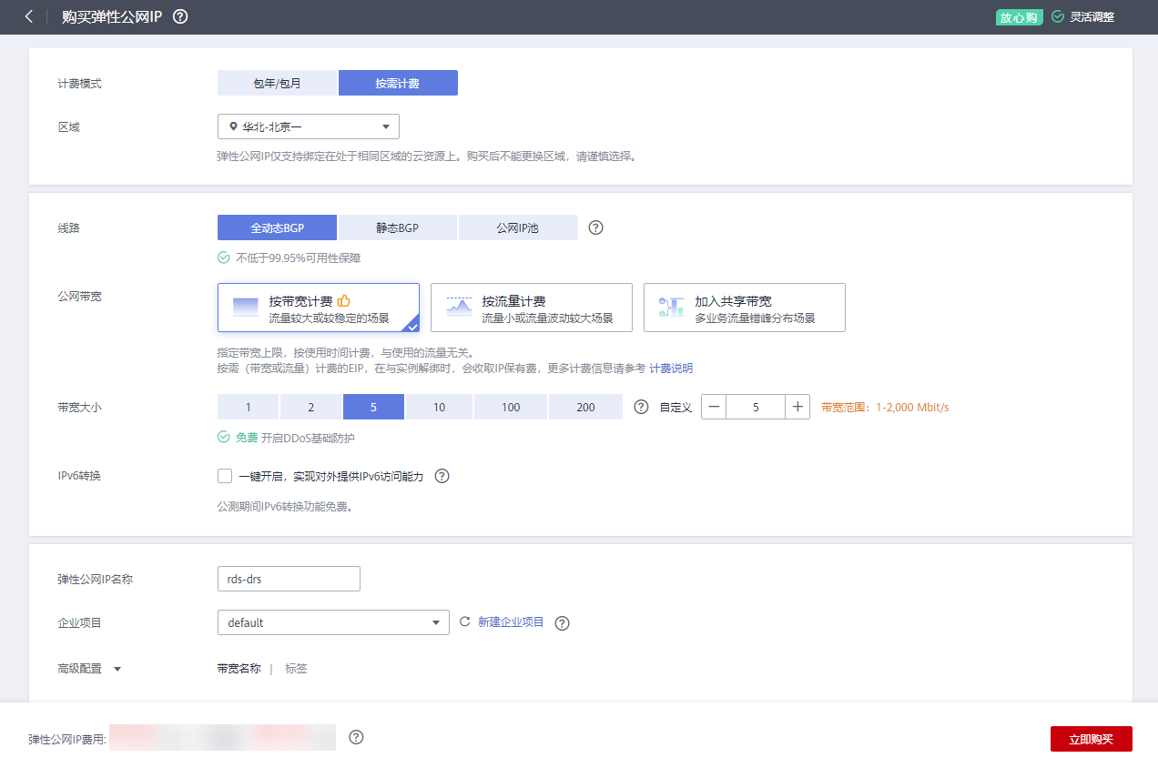 - 3 在“购买弹性公网IP”页,根据页面完成基本信息和带宽配置