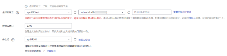 选择实例所属的VPC和安全组、配置数据库端口,VPC和安全组已在创建VPC和安全组中准备好。