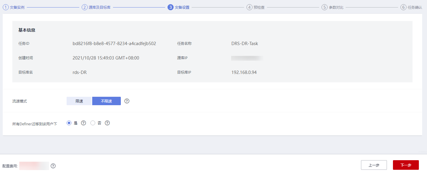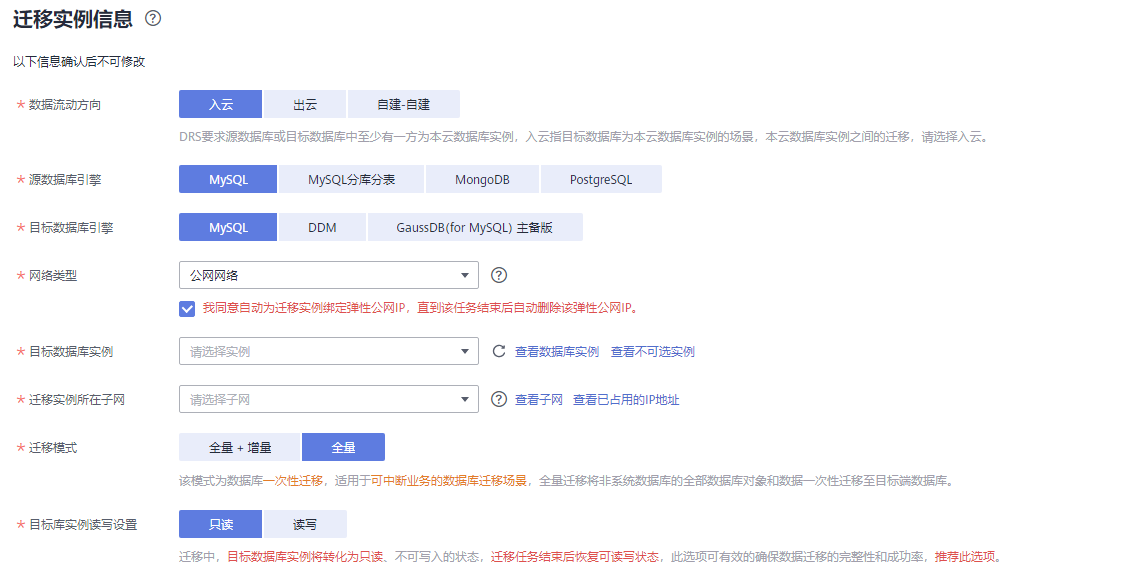 这里的目标库选择创建RDS for MySQL实例创建的RDS实例。