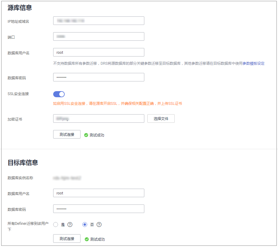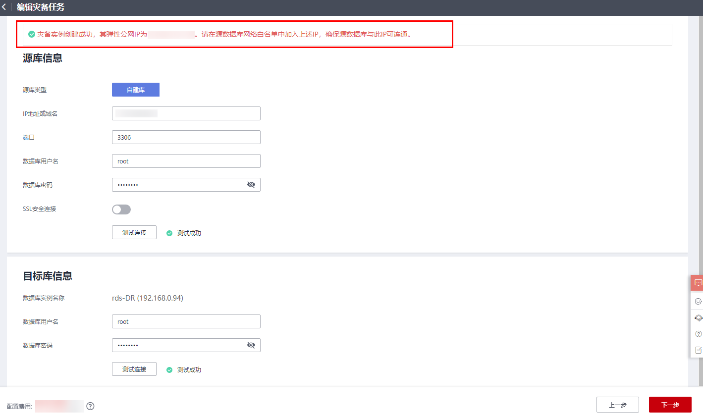 源库信息中的“IP地址或域名”填生产中心MySQL实例绑定的EIP,“端口”呢填写生产中心MySQL实例的端口号。测试通过后,单击“下一步”就可以啦