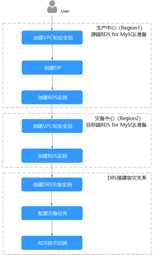 创建RDS业务实例以及灾备实例,并且需要把业务实例数据迁移到灾备实例的整个流程主要任务可以表示成下面这样