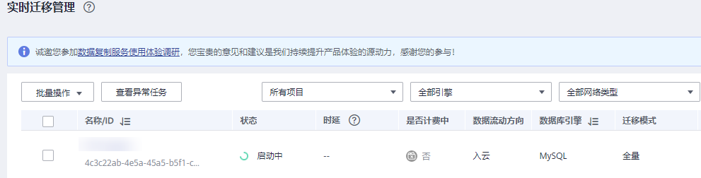 返回DRS实时迁移管理,查看迁移任务状态,启动中状态一般需要几分钟,请耐心等待。