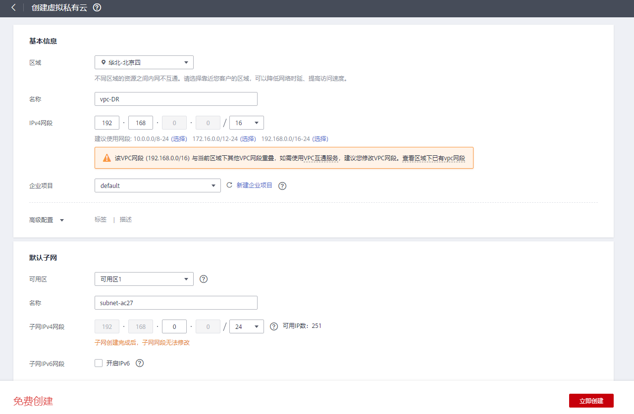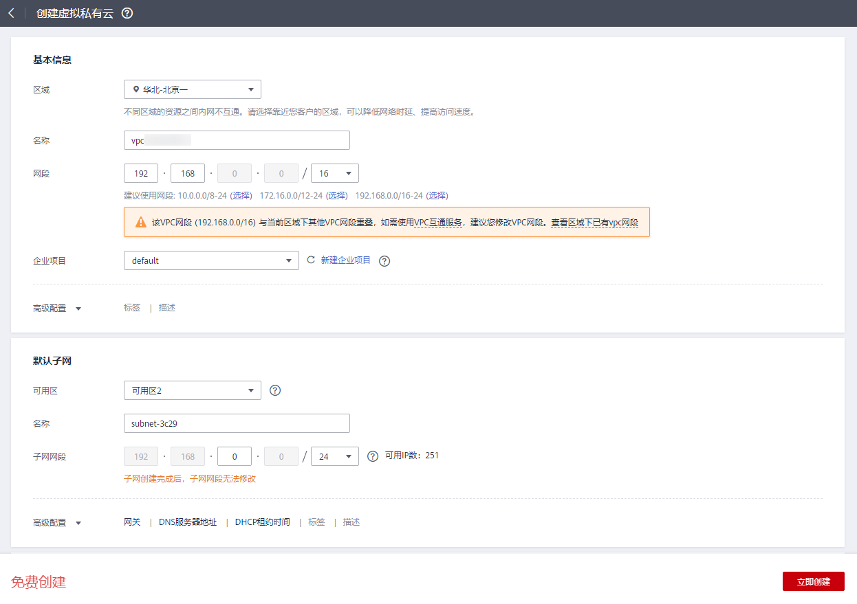 5.在“创建虚拟私有云”页面,根据页面完成基本信息、子网配置和地址配置。