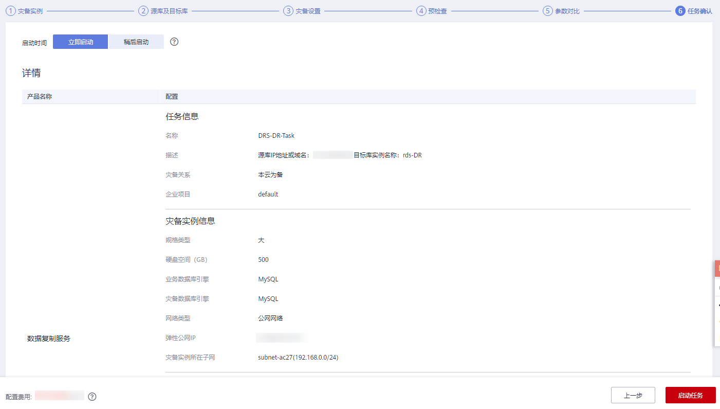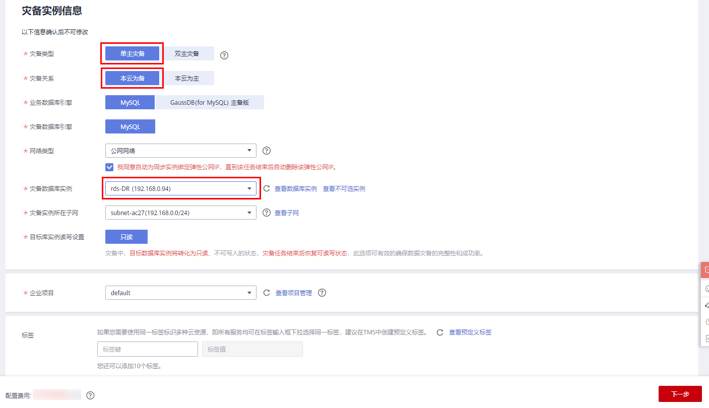灾备类型选择“单主灾备”,灾备关系选择“本云为备”,灾备数据库实例选择在“华北-北京四”新创建的MySQL灾备实例,单击“下一步”,开始创建灾备实例