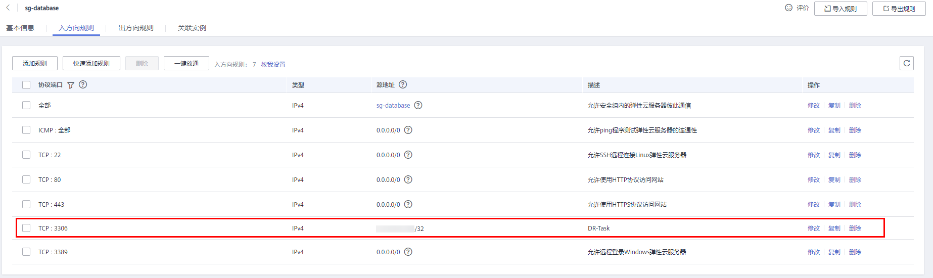 - 2 根据界面提示,将灾备实例的弹性公网IP加入生产中心MySQL实例所属安全组的入方向规则,选择TCP协议,端口为生产中心MySQL实例的端口号。