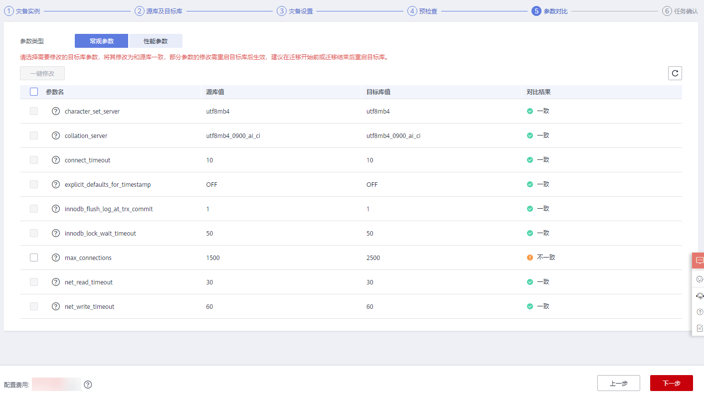 - 1 若您选择不进行参数对比,可跳过该步骤,单击页面右下角“下一步”按钮,继续执行后续操作。