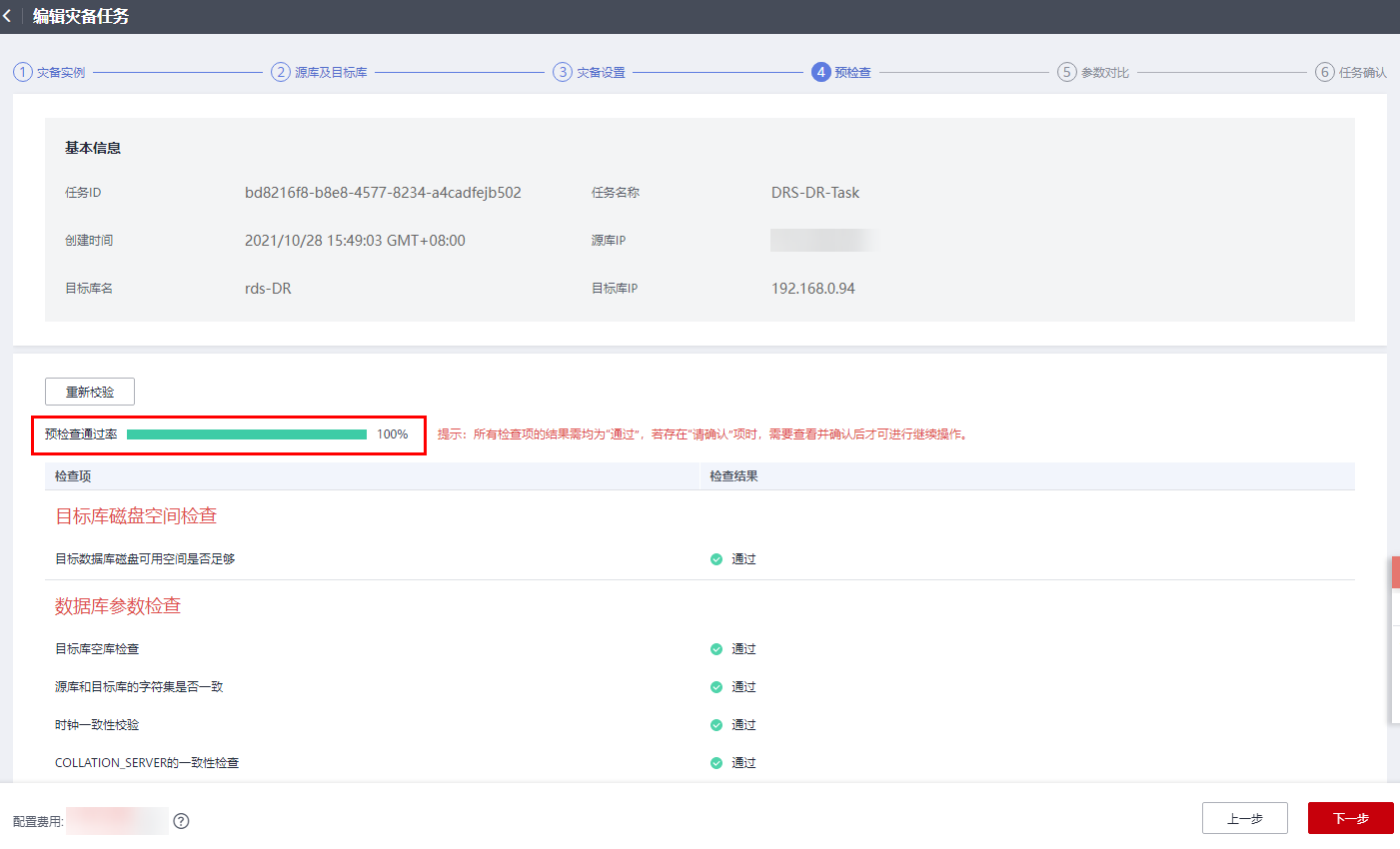然后单击“下一步”,在“预检查”页,进行迁移任务预校验,校验是否可进行任务迁移。