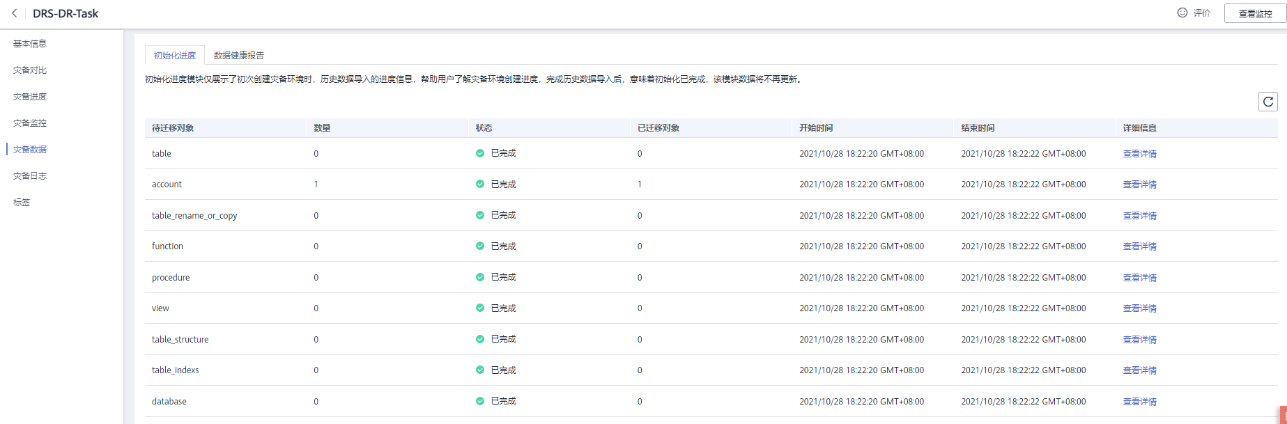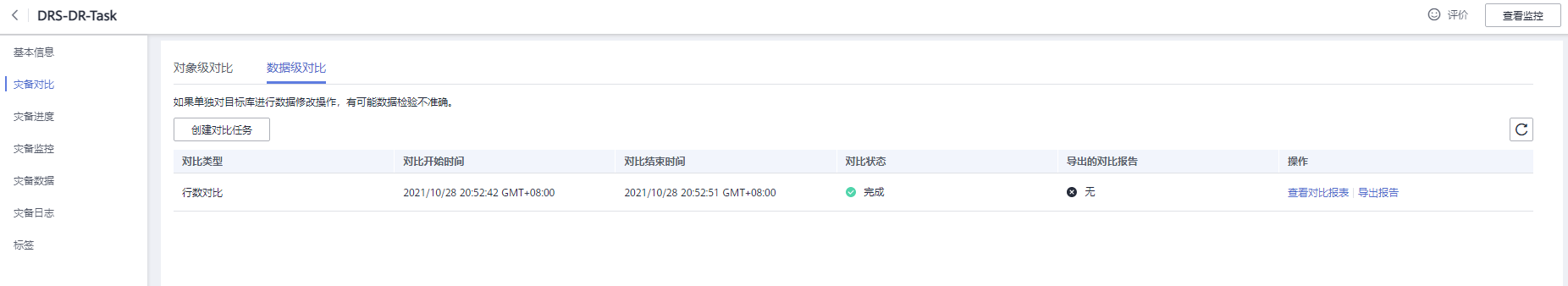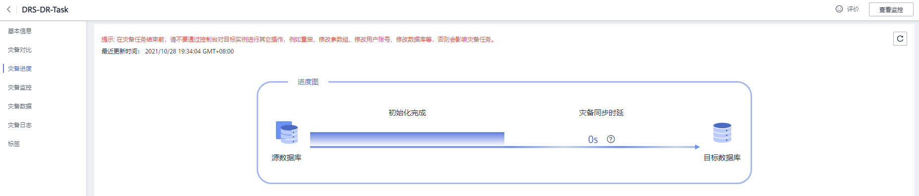 单击灾备实例名称,确认灾备对比、灾备进度、灾备数据分别如下