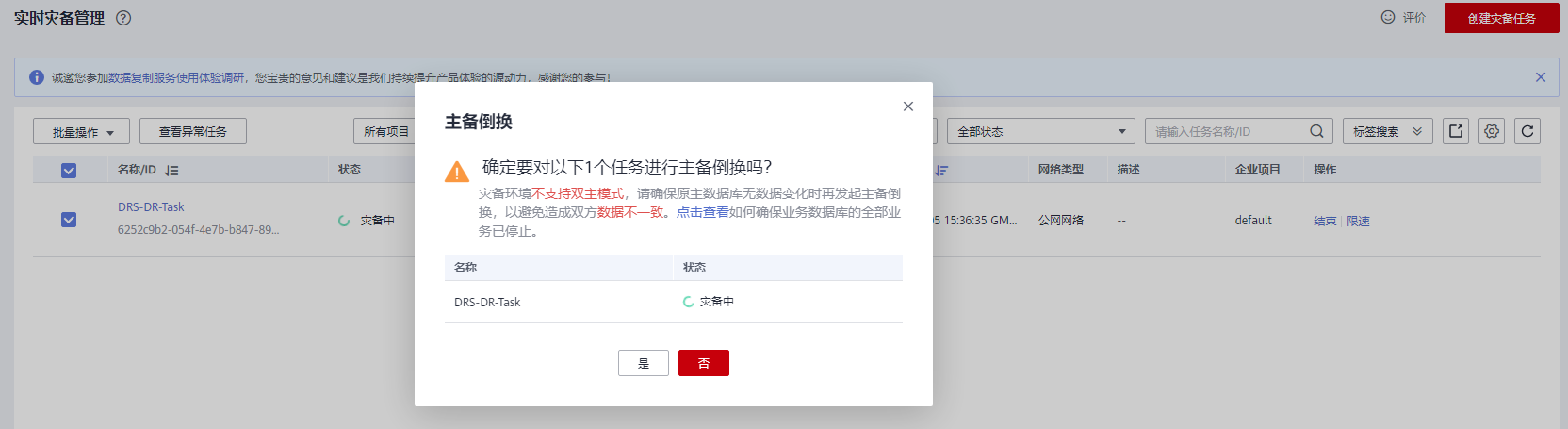 选择“批量操作 > 主备倒换”,把灾备实例由只读状态更改为读写状态