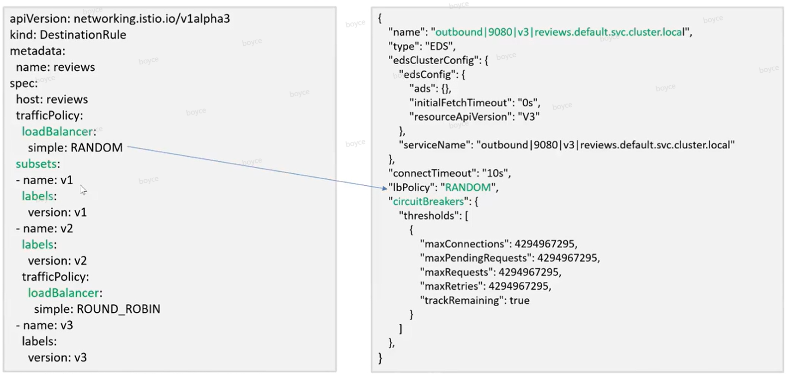 我们可以通过下图看观察 DestinationRule 和 Envoy 之间负载均衡策略配置的对应关系: