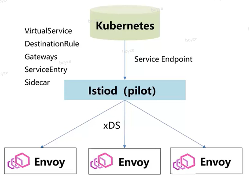 Istiod 生成 xDS 配置,然后通过 gRPC 连接发送给所有的 Envoy,等待 Envoy 加载之后就能按照上层的配置进行工作。