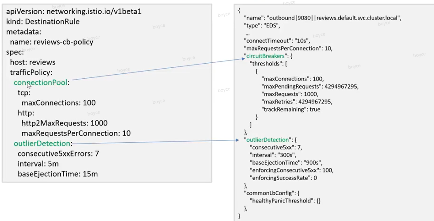 我们可以通过下图观察 DestinationRule 和 Envoy 之间熔断和异常检测配置的对应关系: