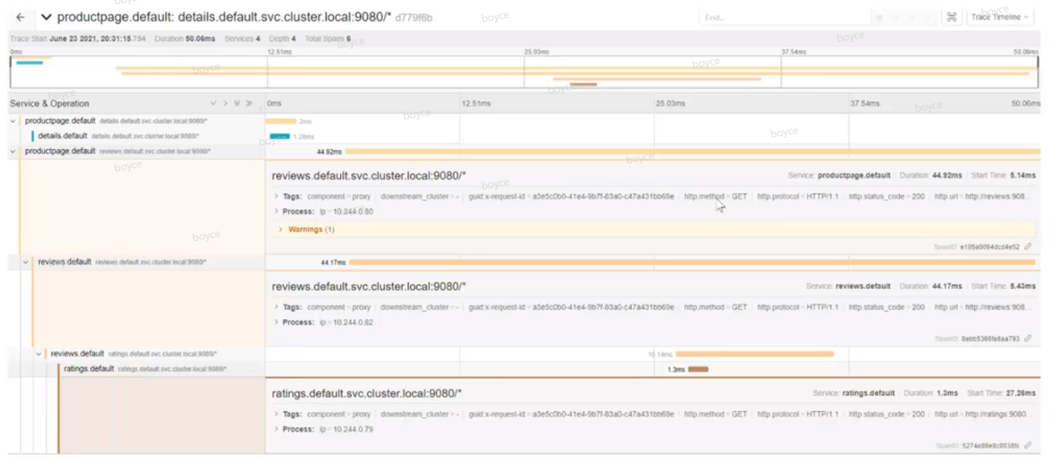 Trace 并非完全零入侵,应用必须进行调用链埋点,即从接收的请求中采集相关 Trace 信息(比如,x-request-id,x-b3-traceid,x-b3-spanid,x-b3-parentspanid,x-b3-sampled,x-b3-flags,x-ot-span-context),并且发送给下一个服务,最后 Envoy 可以将这些 Trace 信息发送给各种 Trace 后端服务(比如,Zipkin,Lightstep,Datadog,Stackdriver,Opencensus,Skywalking),这些后端服务根据 Envoy 上报的 Trace 进行集成并整合调用之间的关系。