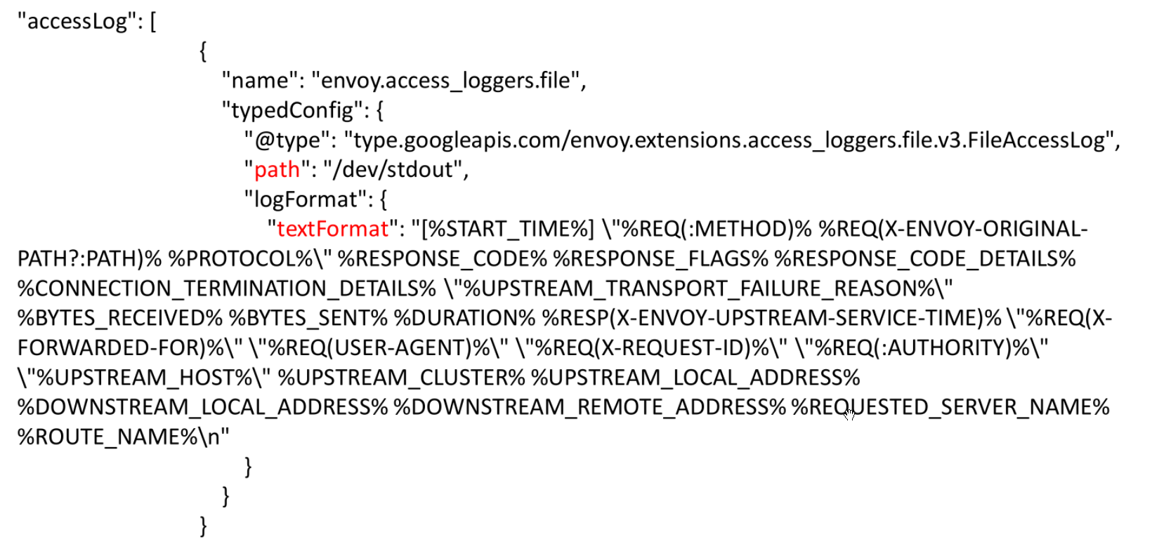 Accesslog 在请求过程中是通过异步方式记录日志,不会因此阻塞正常的访问。支持的 AccewssLog Sink 包括异步写文件,gRPC,stdout,stderr。在 AccessLog 的配置中可以通过 path 指定日志的输出,通过 logFormat.textFormat 执行日志输出的字段。