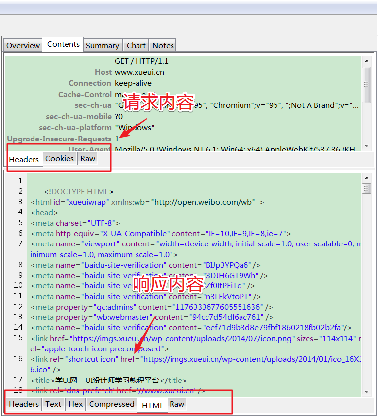 下面在说明一下软件右侧相关功能区域说明,最重要的是 Contents 功能区,上部为请求内容,下部为响应内容,使用的时候要注意切换各种不同的视图查看。