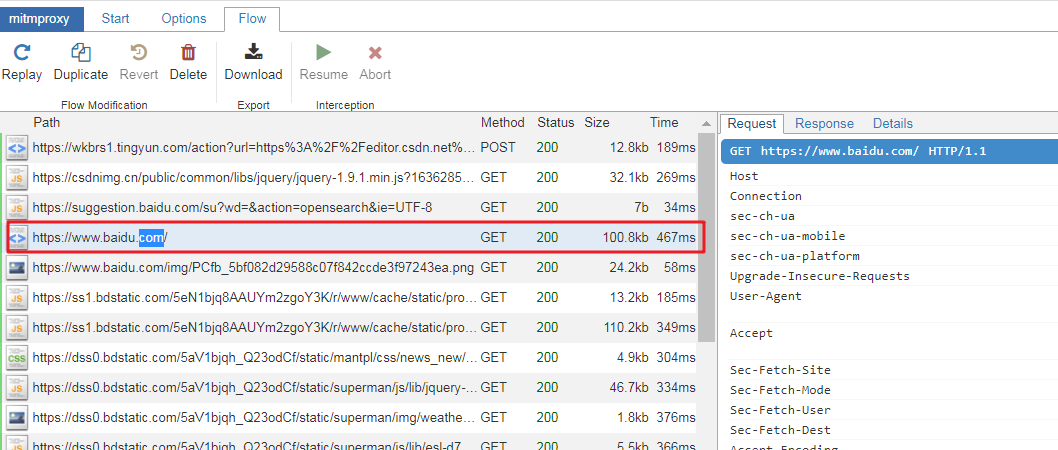 在命令行重启 mitmproxy,刷新浏览器获取如下内容。