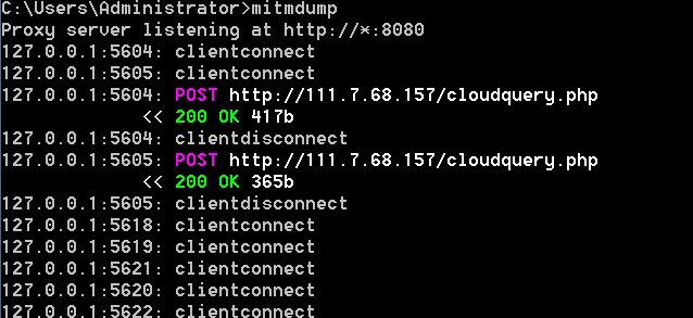 关闭浏览器和控制台之后,再次启动只需要在控制台输入 mitmweb 即可实现,还有一种启动方式,使用 mitmdump ,实现效果如下所示,该形式与 mitmweb 的差异是展示载体不一致,即一个是在网页端,一个是在控制台。