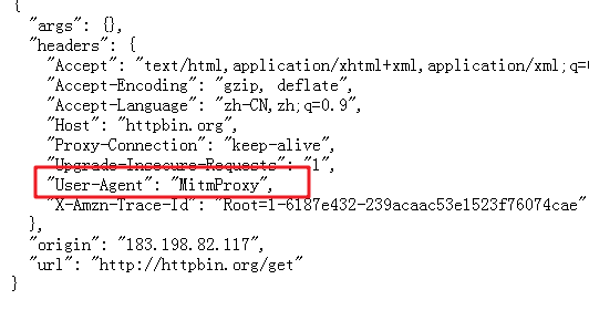 在控制台使用 mitmdump -s script.py 启动文件,并开启浏览器代理,访问 http://httpbin.org/get,此时就会发现用户代理已经被我们成功修改。