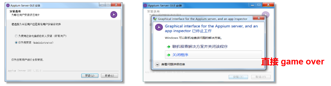 下面就是 Appium 的安装过程了,我当前使用的是 Windows7 操作系统,在安装过程中,仅第一次启动安装包的时候,出现了如下异常,后续一切顺利。