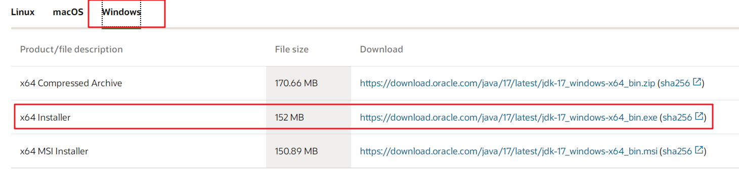 打开 JDK 下载的官网,竟然都 JDK 17了,找到 Windows 版本,下载安装即可。