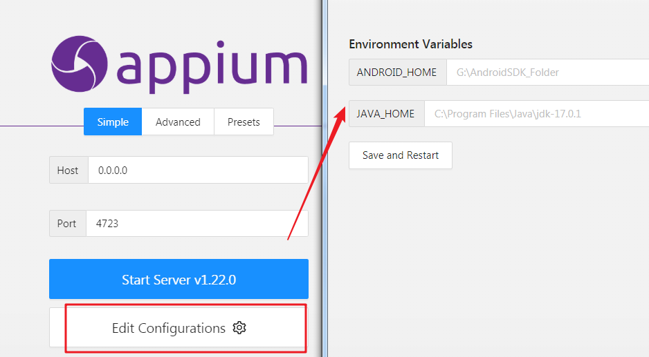 启动 Appium,查看配置中的两个值是否都已经存在,如存在点击 Start Server 。