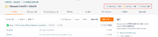 为了更容易找到“LiteOS”代码仓,建议访问https://gitee.com/LiteOS/LiteOS,关注“ Watch”、点赞“Star”、并“Fork”到自己账号下,如下图。