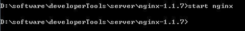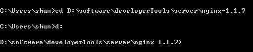 比如我下载后放在D:\software \developerTools\server\nginx-1.1.7,直接cmd后cd D:\software\developerTools \server\nginx-1.1.7,有些不习惯命令行的可能会奇怪,它没有进行到那个文件夹。windows并不会在分区间跳转,除非你自己指定了。所以我们要直接d:如下: