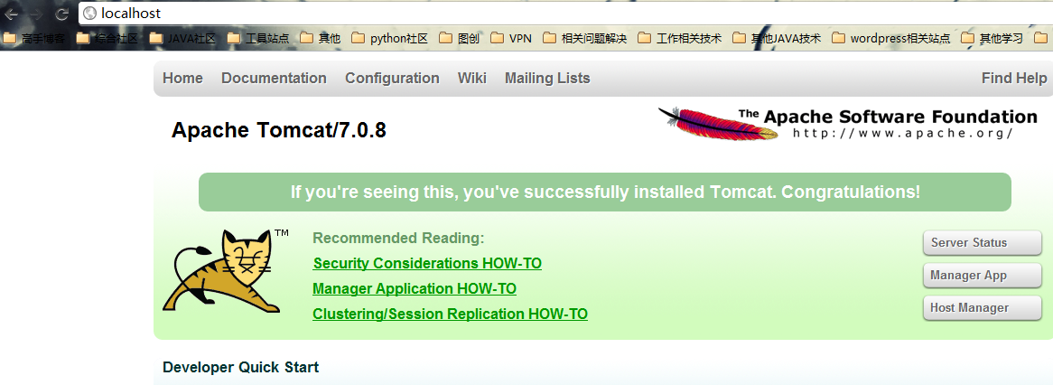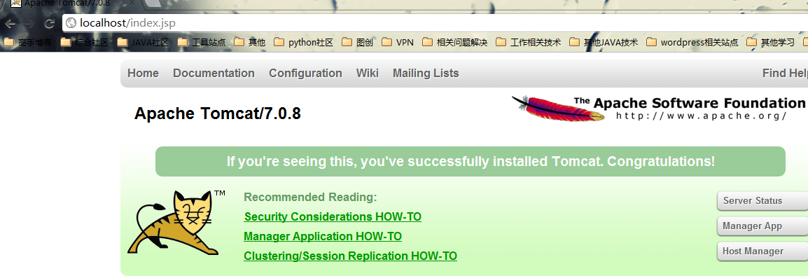 这时,我们发现它并不是刚才的welcome页面了,而是tomcat的管理页面了,不管我们点击什么链接都是没问题的,相当于直接访问http://localhost:8080一样。