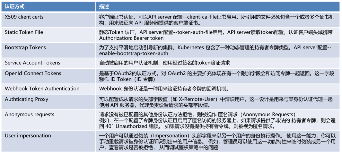 Kubernetes使用身份认证插件利用客户端证书、持有者令牌(Bearer Token)、身份认证代理(Proxy)或者HTTP基本认证机制来认证API请求的身份。
