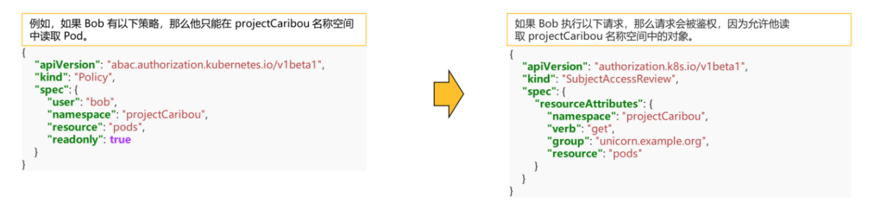 如果Bob在projectCaribou名字空间中请求写(create或者update)对象,其鉴权请求将被拒绝。如果Bob在非projectCaribou名字空间中请求读取(get)对象,其鉴权也会被拒绝。