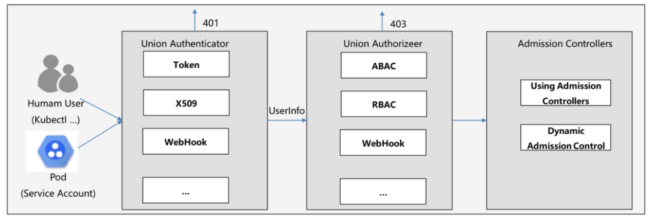 如上图所示,当Token、X509、WebHook等流程出现问题时,会直接返回客户端状态码401。当认证模块没有问题,请求会进入鉴权模块,如果ABAC、RBAC、WebHook等流程出现异常,会直接返回客户端状态码403。