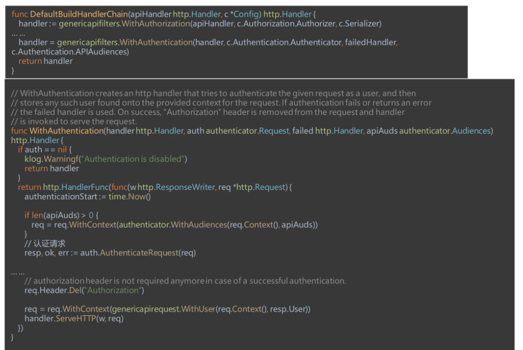 defaultBuildHandlerChain中包含了多种filter(如认证、链接数检验、RBAC权限检验等),在WithAuthentication中完成认证流程,在WithAuthorization中完成鉴权流程。WithAuthentication 函数中通过auth.AuthenticateRequest(req)处理请求。