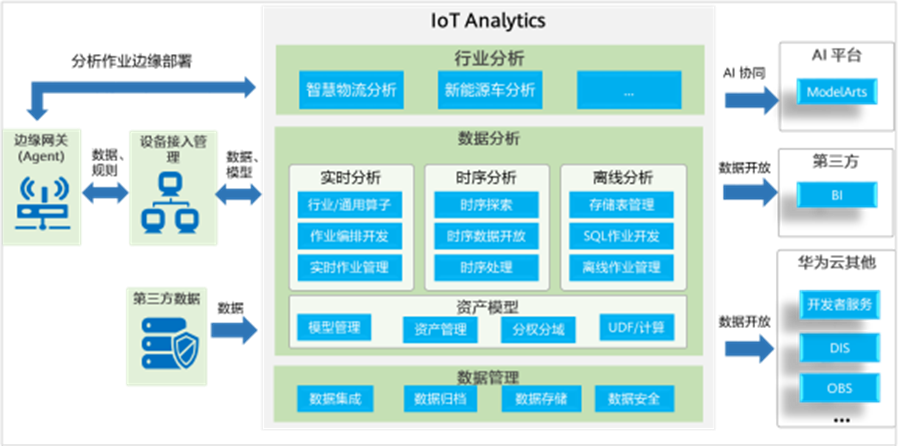 IoT数据分析服务支持设备接入管理服务和多种第三方服务作为数据源,将数据集成、归档、存储后进行分析,分析引擎基于资产模型理解数据,支持实时分析、时序分析和离线分析。此外,针对行业用户,IoT数据分析后还提供了行业分析套件,包括智慧物流行业、新能源车分析行业等。分析后的数据,可以协同AI平台利用,也可以开发给第三方应用或华为云其他服务。数据分析的架构如下图所示。