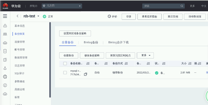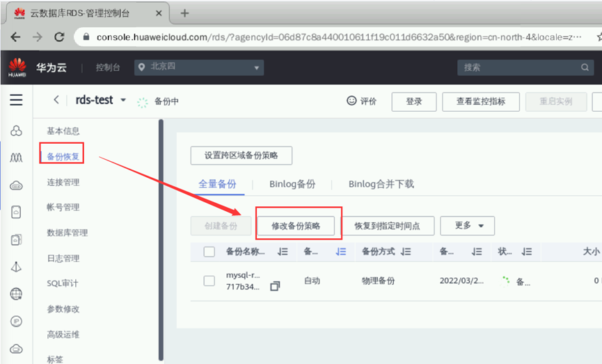 在数据库详情中,点击左侧菜单中的【备份恢复】,在备份恢复页面中,点击【修改备份策略】,可在弹窗中根据所需修改备份策略。保留天数改为:1天。修改后点击确定,即可完成修改。