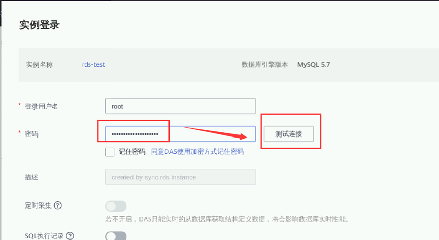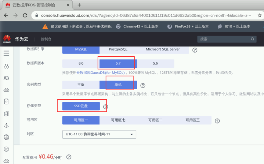 填选实例相关信息。① 计费模式:按需计费② 区域:华北-北京四③ 实例名称:rds-test④ 数据库引擎:MySQL⑤ 数据库版本:5.7⑥ 实例类型:单机⑦ 存储类型:SSD云盘⑧ 可用区:任选⑨ 时区:默认。