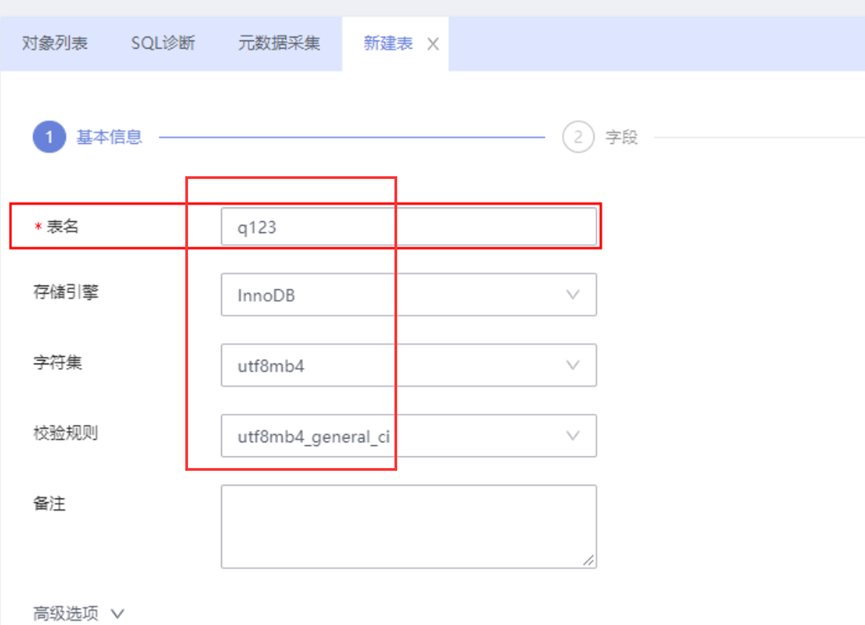 根据需求填写基本信息、字段等信息,立即创建表。① 表名:自定义② 存储引擎:默认③ 字符集:默认④ 校验规则:默认⑤ 备注:自定义⑥ 高级选项:默认